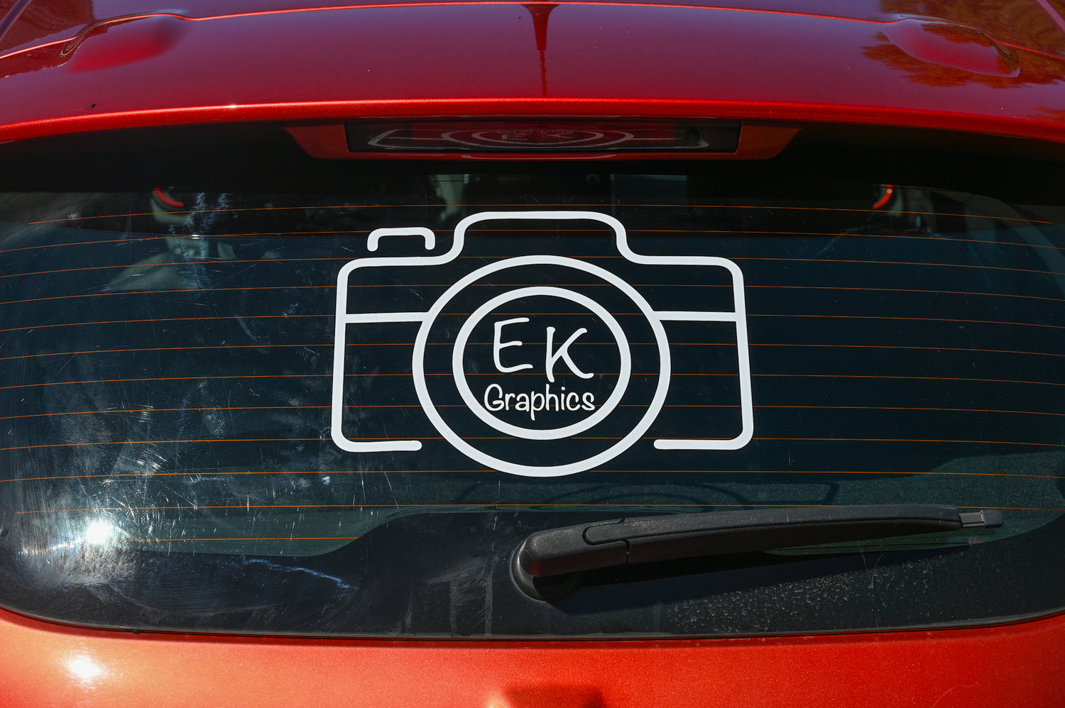 Wit logo aangebracht op de achterruit van een personenauto voor een professionele, maar subtiele uitstraling.